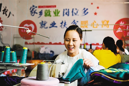 下图 5月23日,江西省上饶市铅山县新滩乡华福服装加工厂扶贫车间,贫困户在加工服装。为打赢脱贫攻坚战,近年来,铅山县大力建设扶贫车间,吸纳贫困劳动力就近就地就业,实现“造血式”脱贫。截至目前,该县共建设扶贫车间25个。丁铭华摄(中经视觉)