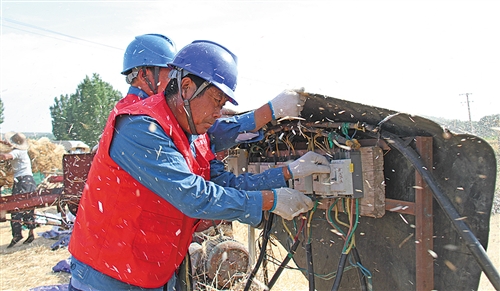 6月1日,国网费县供电公司彩虹党员服务队队员周末加班为山东费县新庄镇北葫芦山村村民检查维护麦场用电设备,倾力保障初夏农民抢收抢种。陈 艳摄(中经视觉)