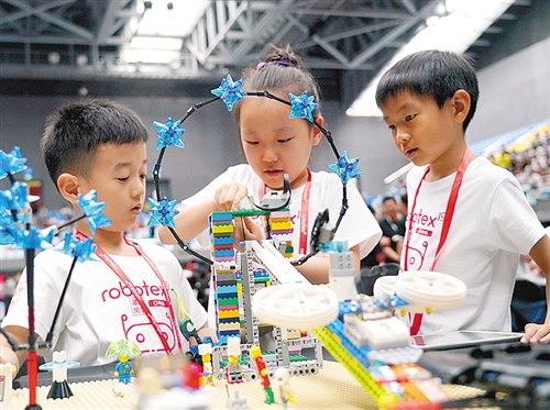 6月1日,小选手们在北京大兴新城体育中心机器人大赛现场。当日,“2019Robotex世界机器人大赛华北区选拔赛”开幕。为期两天的比赛提供了施展才华、互相学习的平台,吸引了来自全国的1000多名选手。