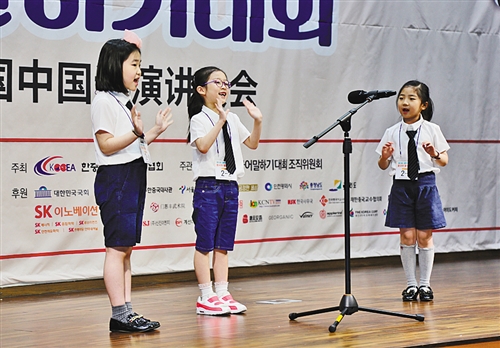 第十三届大韩民国中国语演讲大会近日在韩国首尔大学举行。图为韩国小学生声情并茂地用中文演讲。