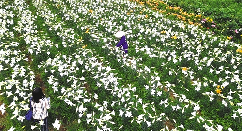 6月8日,游客在贵州省台江县老屯乡百合种植基地赏花(无人机拍摄)。 近日,贵州省黔东南苗族侗族自治州台江县老屯乡种植的400余亩各色百合花陆续绽放,吸引众多游客前来观赏。2016年以来,台江县老屯乡以“公司+合作社+贫困户”的模式实施百合花种植扶贫项目,既带动了乡村旅游,又促进当地村民增收。