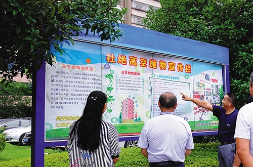 6月25日,湖南省洞口县花古街道黎园新村小区,居民正在杜绝高空抛物宣传栏前听物业管理人员讲解高空拋物的危害。当日,洞口县安洁物业管理有限公司举办“维护公共安全 杜绝高空拋物”宣传活动。 滕治中摄(中经视觉)