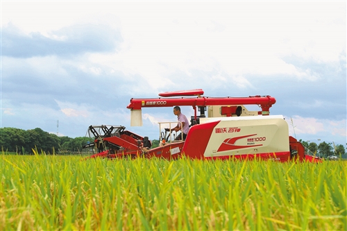 7月12日,江西省兴国县长冈乡上社村,收割机在收割早稻。近日,该县早稻陆续成熟,当地农民抢抓农时,确保颗粒归仓。陈 鹏摄(中经视觉)