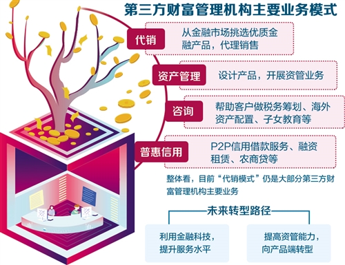 目前,国内部分第三方财富管理公司实际上充当着“销售掮客”的角色,这些公司从大型金融机构批发产品,雇佣大量“理财顾问”销售给客户,自己从中抽取不菲佣金。如此“财富管理”,很难在风险控制上做到独立和专业。对于第三方财富管理机构来说,应提升合规和风控水平,积极探索未来发展方向——