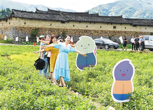 近日,首届两岸花生节在福建省永泰县长庆镇举行。拔花生大赛、花生DIY等活动吸引了众多游客参观、体验。图为游客在花生田埂上拍照。 (新华社发)