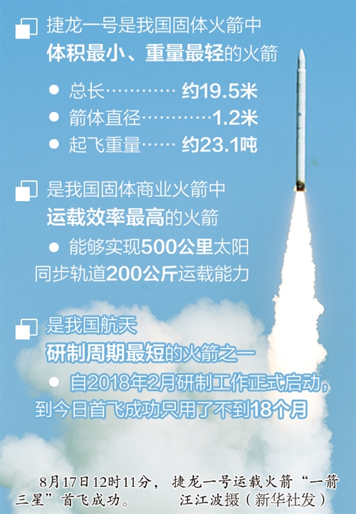 捷龙一号是火箭院所属中国长征火箭有限公司采用商业化模式面向商业小卫星发射市场打造的一款小型固体运载火箭。同时,它也是中国航天科技集团有限公司首型商业运载火箭。自2018年2月研制工作正式启动,到今日首飞成功,捷龙一号只用了不到18个月,成为中国航天研制周期最短的火箭之一。
