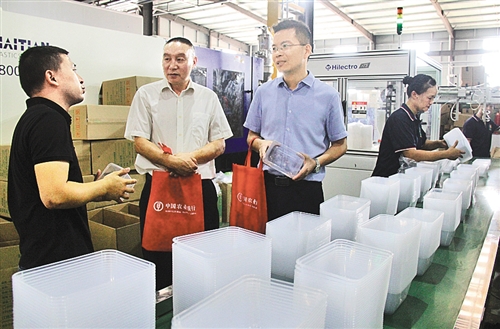 近日,江西省宜黄县银保监办和农行工作人员在艾美科技有限公司考察企业升级改造项目运行情况。宜黄县是江西省塑料制品产业基地,当前正着力推动塑料产业向工程塑料和食品塑料升级转型。目前,宜黄农行已为该公司提供了2000万元综合授信业务,帮助企业增加了两条先进塑料生产线。 罗健文摄(中经视觉)