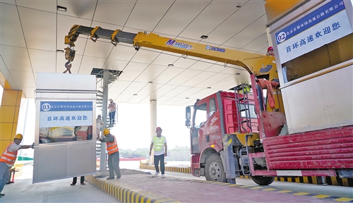 9月3日,北京市首都地区环线高速公路采育南主线省界收费站,工作人员正在进行拆除改造施工。这是北京市范围内拆除的首座省界收费站,年底前北京将取消8个高速公路省界收费站。据统计,北京市需要建设ETC门架348个,改造出入口站车道1038条,建设入口治超系统约140处。