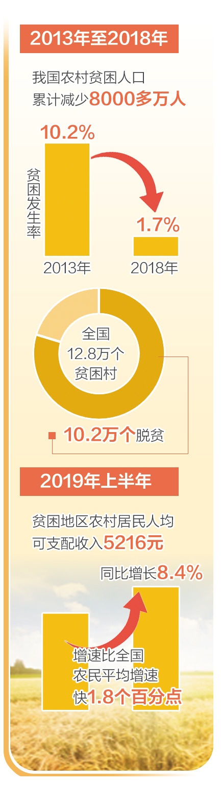 “新中国成立前,国家积贫积弱,人民一贫如洗。新中国成立70年来,中国共产党和中国政府始终高度重视扶贫工作,把扶贫开发纳入经济社会发展全局同步推进,把消除贫困、改善民生、实现共同富裕作为矢志不渝的奋斗目标。”刘永富介绍说,改革开放以来,特别是党的十八大以来,经过6年多的不懈努力,脱贫攻坚取得了决定性进展和重大历史性成就。一方面,农村贫困人口大幅减少。按照我国农村现行扶贫标准,2013年至2018年,我国农村贫困人口累计减少8000多万人,每年减贫人数都保持在1200万人以上,贫困发生率从10.2%下降到1.7%,全国832个贫困县有436个已脱贫摘帽,全国12.8万个贫困村有10.2万个脱贫,区域性整体贫困明显缓解。