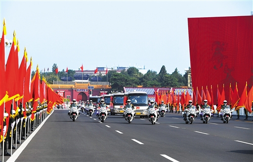 9月29日上午,国家勋章和国家荣誉称号获得者乘坐礼宾车,在国宾护卫队的护卫下,前往人民大会堂。新华社记者 张 领摄