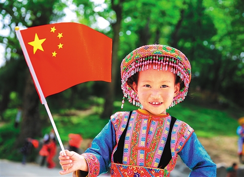 ◀湖南省邵阳市隆回县,瑶族小朋友拿着国旗拍照留念。 曾 勇摄(中经视觉)