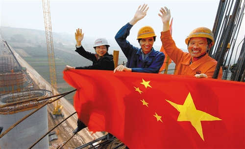 ▶中铁四局建设者在大西铁路客运专线晋陕黄河特大桥工地庆祝国庆。 张华先摄