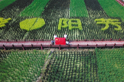 ▶贵州省黔东南苗族侗族自治州,南方电网公司凯里供电局电力工人在五彩稻田与国旗留念。 蔡兴文摄