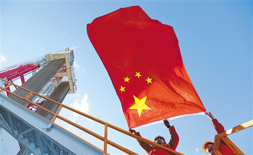 ▶位于新疆克拉玛依的西部钻探准东钻井公司70514钻井队作业现场,五星红旗高高飘扬。