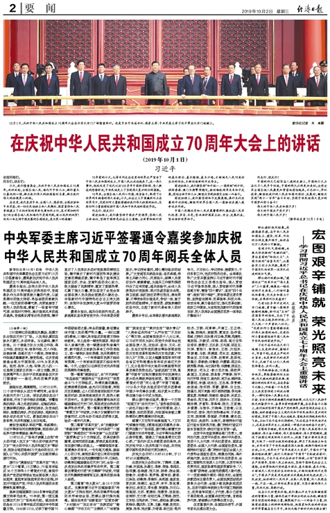 新华社北京10月1日电 壮阔七十载,奋进新时代。10月1日上午,庆祝中华人民共和国成立70周年大会在北京天安门广场隆重举行,20余万军民以盛大的阅兵仪式和群众游行欢庆共和国70华诞。中共中央总书记、国家主席、中央军委主席习近平发表重要讲话并检阅受阅部队。