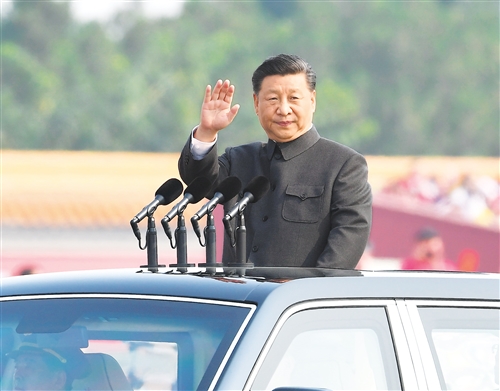 雄壮的军乐声中,习近平乘车沿着宽阔的长安街,依次检阅15个徒步方队、32个装备方队。近15000名受阅官兵整齐列阵、英姿勃发,580台受阅装备在阳光下熠熠生辉。这是中国特色社会主义进入新时代的首次国庆阅兵,也是共和国武装力量改革重塑后的首次整体亮相。