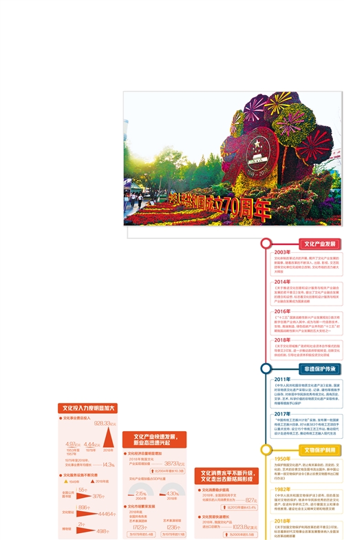 新中国成立70年,文化事业气象万千。文化事业的蓬勃发展,让百姓的精神生活五彩斑斓,为经济社会发展奏出时代旋律,让传承创新的中华文化持久闪耀。