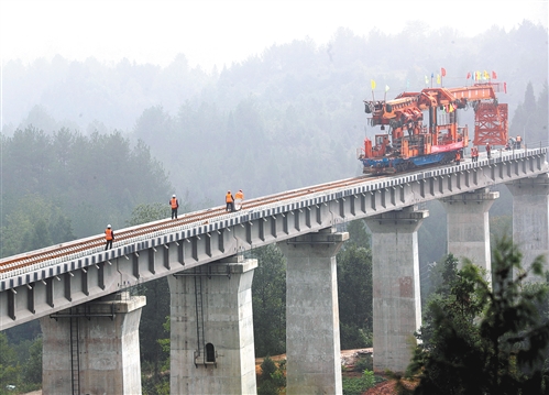 10月29日,在渝怀铁路二线重庆黔江段刘家院子特大桥上,中铁十一局工作人员在架设桥梁。渝怀铁路二线是国家中长期铁路网规划的重要建设项目,是川渝地区连接我国华中、华南地区重要的铁路运输通道。该线路在既有渝怀铁路旁增建,全长625公里,设计时速120公里。目前工程进展顺利,全线有望明年建成通车。杨 敏摄(中经视觉)