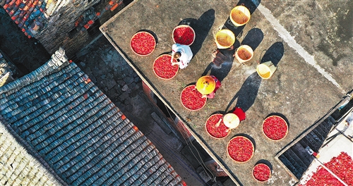 11月1日,湖南省新田县陶岭镇东山岭村,村民正在晾晒采摘的“陶岭三味辣椒”种子。近年来,该村依托陶岭三味辣椒“国家地理标志产品”这一金字招牌,对传统辣椒品种进行提纯复壮,并采取“公司+农户+互联网”模式,带动周边100余家农户种植辣椒200余亩,实现脱贫致富。刘贵雄摄(中经视觉)