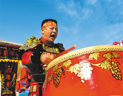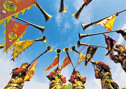 江西省万载县得胜鼓是一种大型吹打乐,由民间唢呐曲牌和民间锣鼓乐器巧妙结合,富有浓厚的地方特色和乡土气息。2008年,万载得胜鼓被列入第二批中国国家非物质文化遗产名录。如今在民间,凡娶亲嫁女、生日祝寿、华厦落成、开业庆典、欢庆佳节及其他纪念活动,皆请民间艺人演奏得胜鼓,以增添欢快热烈和吉祥如意的喜庆氛围。 图/文 邓龙华
