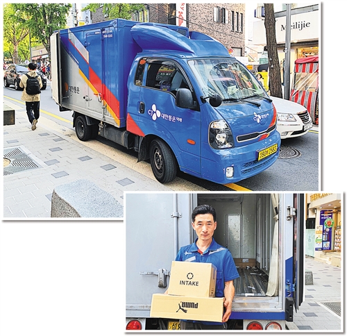 目前,在韩国街头,随处都能看到或穿梭在车流之间,或快步疾走的配送员。其中,主要包括两类人,一种是开小型货车的,一种是骑摩托的。骑摩托的人一般都是从事外卖服务的,主要为餐馆和顾客提供取餐送餐服务。那些开小货车的人是负责快递业务的。CJ大韩通运、LOGEN、乐天快递、现代快递、韩进快递、东部快递等物流公司都在韩国提供大量快递业务。有趣的是,每个快递公司都会给快递车辆统一涂漆,因此在韩国的街头巷尾,也出现了一大批小蓝车、小黄车、小红车、小白车。