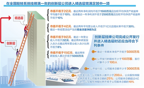 征求意见稿中明确:挂牌满一年的创新层公司可以公开发行股票并进入精选层。业内人士表示,这次新三板改革,好比把一个平房改造成立体高楼,比较符合中小企业的成长发展路径:在一楼(基础层),企业尚处规范期,配一个小院,可以种菜浇花,没那么多的约束;上了二楼(创新层),有了固定格局,多了些约束(信息披露更严格),但财务更稳健,公司治理更规范,同时经过公开市场一定时间的规范和检验;想站得更高看到更广阔的风景,就到三楼(精选层),三楼“住户”财务状况良好、市场认可度较高、公众化水平可以支撑流动性。这样有利于防控风险,将不同层级公司挂牌成本和收益匹配起来。