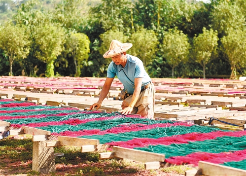 11月13日,工人在福建省永春县达埔镇的一家制香公司晒香。