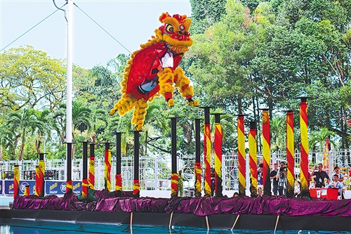 日前,第一届马来西亚国际水上跳桩狮王争霸赛在吉隆坡举行。图为新加坡艺威体育会舞狮队在比赛中。