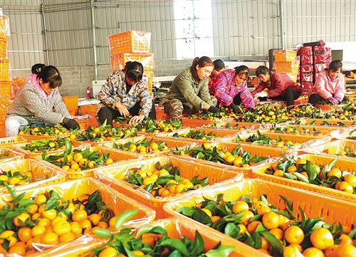 近年来,广西环江毛南族自治县充分发挥供销合作系统的桥梁纽带作用,着力打造“三农”服务综合平台,目前已建成示范性地头冷库5个、选果厂2家,就近带动贫困户就业100余人,人均年增收6000元。图为在位于环江毛南族自治县大才乡的供销合作社选果服务中心,工人们在装筐、打包经自动化选果机分拣后的新鲜砂糖橘。