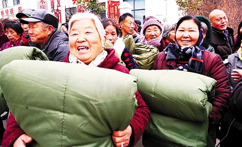 2019年12月20日,河南省汝阳县十八盘乡木庄村的困难群众领到新棉被后喜笑颜开。连日来,驻河南省汝阳县的省、市、县扶贫帮扶单位广大党员干部积极开展冬季“暖心行动”,给困难群众送去棉被、棉衣、牛奶、鸡蛋及日常生活用品,把党和政府的关怀送到山区百姓家中。 康红军摄(中经视觉)