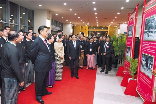 仪式开始前,习近平在缅方领导人陪同下,观看了庆祝中缅建交70周年图片展。图片展记录了中缅建交70年来双方交往中的一幕幕感人画面。习近平不时驻足,认真听取讲解并仔细观看。