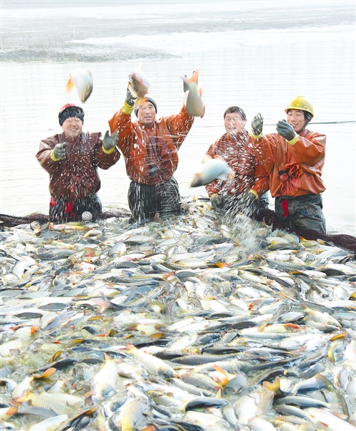 1月19日,江苏连云港市东海县曲阳乡,渔民们在拉网捕鱼。春节将至,素有“百库之县”美称的东海县各地陆续迎来围网冬捕。张 玲摄(中经视觉)