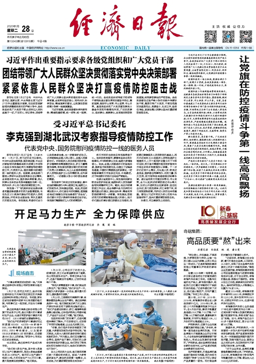 新华社武汉1月27日电 (记者刘铮) 1月27日,受习近平总书记委托,中共中央政治局常委、国务院总理、中央应对新型冠状病毒感染肺炎疫情工作领导小组组长李克强赴武汉考察指导疫情防控工作,代表党中央、国务院慰问疫情防控一线的医务人员。他强调,各地各部门要深入贯彻中央政治局常委会会议精神,全面落实党中央、国务院决策部署,把人民群众生命安全和身体健康放在第一位,同舟共济、齐心协力做好疫情防控工作。