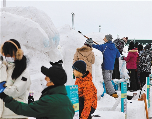 第71届日本札幌冰雪节日前开幕。本届札幌冰雪节共设置3个会场,活动将持续至2月11日。图为当地市民在活动现场制作雪雕。 新华社记者 杜潇逸摄