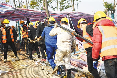 二月五日,武汉雷神山医院施工现场,建设者们在紧张地安装电缆。 本报记者 高兴贵摄