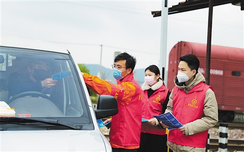 2月15日,中国铁路南昌局集团鹰潭工务段员工在鹰潭市皖赣线硬石岭道口开展疫情防控宣传。连日来,鹰潭工务段结合铁路沿线“点多线长覆盖面广”的特点,组织员工在各铁路道口向返工人员普及旅途、车间、办公场所疫情防控知识。据悉,目前鹰潭市复工复产有序推进,在物联网企业聚集的鹰潭高新区,截至2月15日已审批可复工工业企业45家,其中规上企业35家;已复工企业42家,近日可复工企业3家。 徐国栋摄(中经视觉)