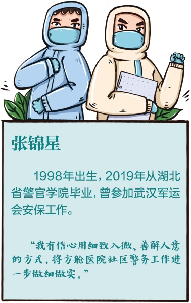 武汉市公安局东西湖分局有关负责人介绍,2月11日,为更好服务群众、做好警务工作,东西湖分局成立了“方舱社区”警务室。21名民警及77名安保人员日夜坚守在这个由1400余名轻症患者和900余名医护人员组成的特殊社区内,像张锦星这样的“90后”民警,用实际行动展现了“红颜更胜儿郎”的青春风采。