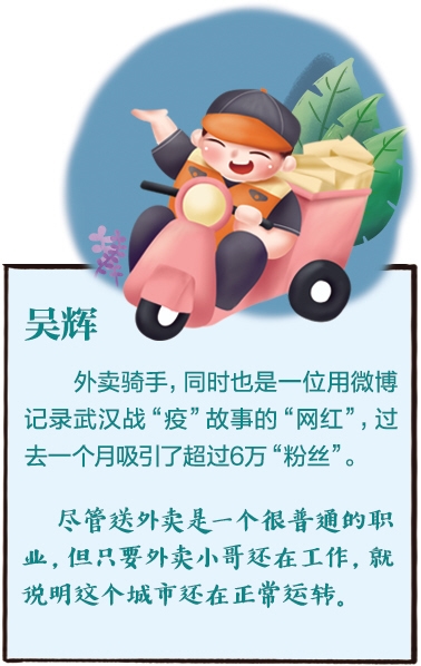 在为大家服务的同时,吴辉对自己的工作也有了全新感受。他说,尽管送外卖是一个很普通的职业,但只要外卖小哥还在工作,就说明这个城市还在正常运转。