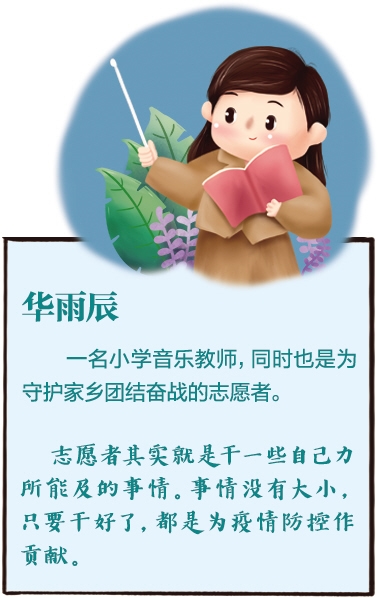 “志愿者其实就是干一些自己力所能及的事情。事情没有大小,只要干好了,都是为疫情防控作贡献。”华雨辰号召更多人加入志愿者队伍,“疫情还没有结束,我们需要更多的伙伴加入,让我们一起来守护家乡”。