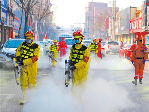 2月19日,河北省文安县民间应急组织赤狐应急救援队对城区街道开展消杀作业。连日来,文安县积极动员志愿服务力量21400余人,奔赴抗疫服务战线,开展消毒防疫、物资保障、义务巡逻、心理援助、防疫宣传等各类志愿服务,科学有序地参与疫情防控工作,防范化解安全隐患。张懿莉摄(中经视觉)