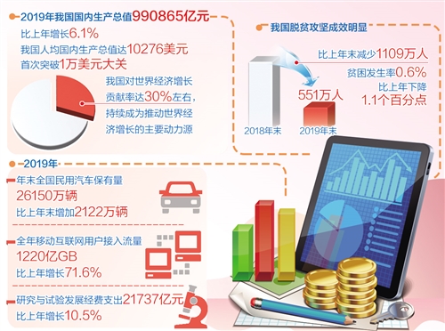 国家统计局副局长盛来运介绍,2019年我国国内生产总值按年平均汇率折算达到14.4万亿美元,稳居世界第二位;人均国内生产总值按年平均汇率折算达到10276美元,首次突破1万美元大关。同时,2019年,我国国内生产总值比上年增长6.1%,明显高于全球经济增速,在经济总量1万亿美元以上的经济体中位居第一;对世界经济增长贡献率达30%左右,持续成为推动世界经济增长的主要动力源。