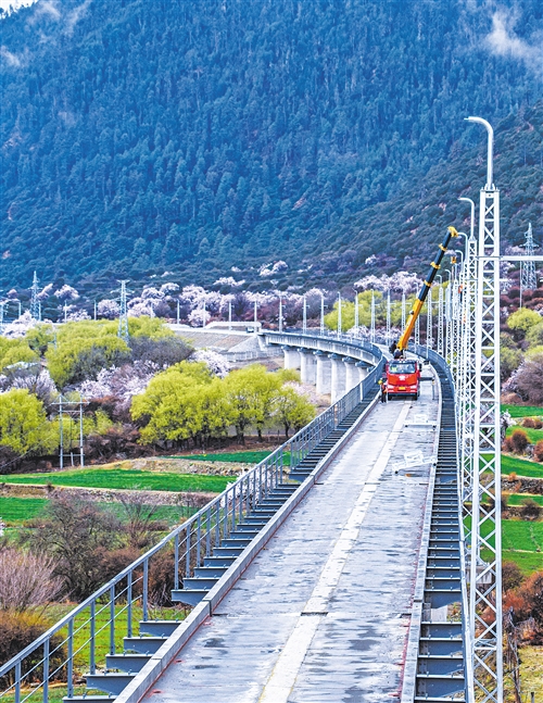 4月2日,在西藏自治区林芝市,建设者在拉林铁路林芝至岗嘎区间进行棘轮框架安装。拉萨至林芝铁路是西藏第一条电气化铁路。随着春暖花开,承建全线电气化施工的中铁电气化局集团有序组织复工复产。王宝成摄(中经视觉)