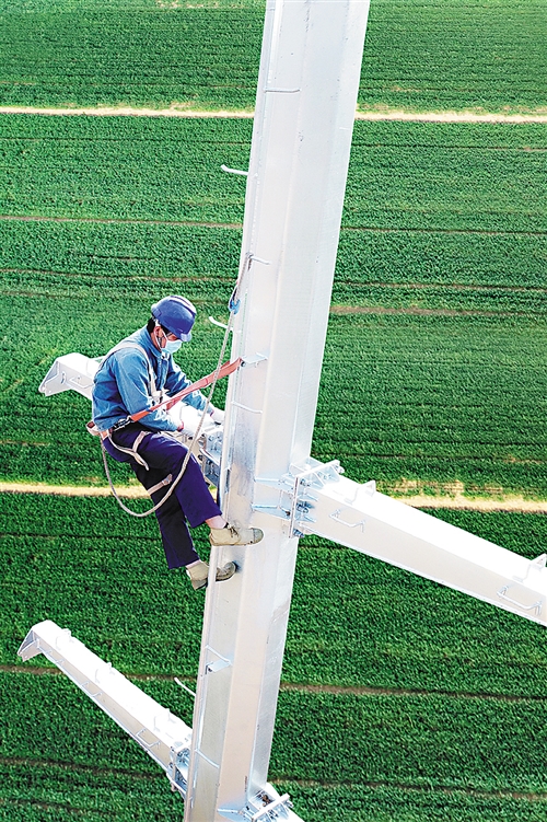 左图 国家电网山东莒南供电公司的施工人员正在进行临沂35千伏壮岗变电站第二电源工程铁塔组立对接工作。连日来,围绕推进企业复工复产,当地全力保障电网运行安全稳定可靠。张竣寓摄(中经视觉)