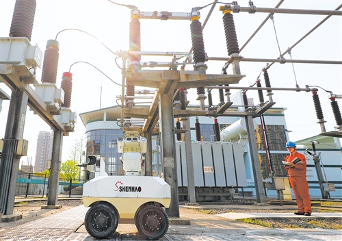 右图 4月9日,国家电网浙江德清供电公司的智慧巡检机器人在德清县110千伏秋山变电站巡视户外高压设备。当地引进智能化设备提高变电站工作效率,为复工复产提供用电保障。王 正摄(中经视觉)