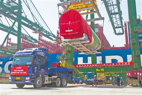 4月11日,在天津港太平洋国际集装箱码头内,第500架次空客A320组件中机头部分,从中远海运星云号集装箱货轮上吊装下船。当日,包括机头、机身和水平尾翼在内的6件空客飞机大部件在天津港完成接卸,随后运往天津滨海新区空客组装基地进行安装。