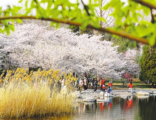 近日,北京各大公园内樱花绽放,相关部门启动多项限流、疏导措施,引导游客健康游园,分时错峰赏花。图为游客在北京玉渊潭公园赏花。本报记者 赵 晶摄