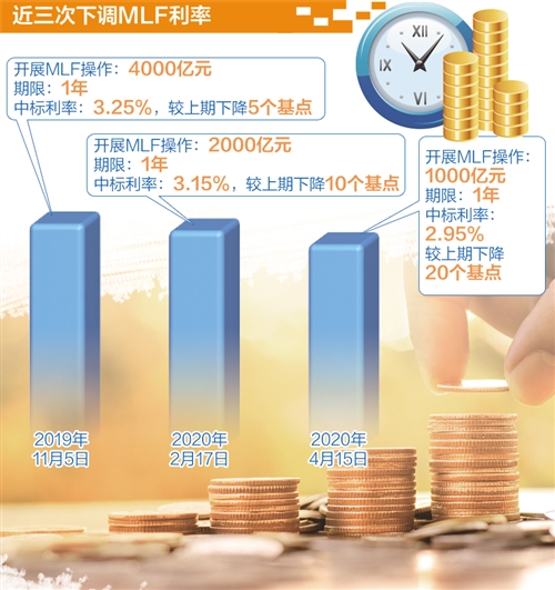 4月15日,中国人民银行宣布开展1年期中期借贷便利(MLF)操作1000亿元,中标利率为2.95%,较上期下降20个基点。这是今年以来MLF利率第二次下调,也是3年来首次跌破3%。由于3月末央行下调了公开市场操作利率,专家认为,本次MLF利率下调符合市场广泛预期,政策利率联动调整,释放出逆周期调节力度加大的信号。