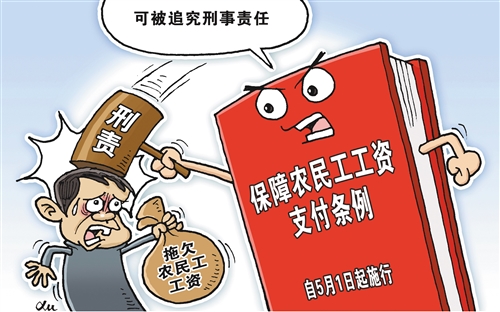 《保障农民工工资支付条例》自5月1日起施行。条例加大了对违法行为的惩戒力度。违反规定拖欠农民工工资的,依照有关法律规定执行,由人力资源社会保障行政部门责令限期支付;逾期不支付的,向劳动者加付应付金额百分之五十以上至百分之一百以下的赔偿金;涉嫌构成拒不支付劳动报酬罪的,及时移送司法机关追究刑事责任。拖欠农民工工资行为屡禁不止,违法成本低是重要原因。恶意欠薪可追究刑事责任,这为根治欠薪“顽疾”提供了重要的法律武器,将对相关违法行为形成有力震慑。 (时 锋)