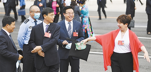 5月25日,十三届全国人大三次会议举行第二次全体会议。代表们步入会场时,人大江苏代表团的付红玲代表(右一)、郑葵阳代表(中)、招启柏代表(左一)就稳就业话题接受记者采访,互相“谦让”谁先回答提问。本报记者 李景录摄