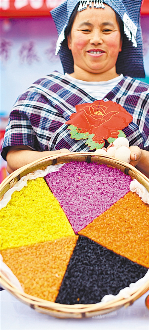 图③ 4月30日,在贵州省黔南布依族苗族自治州福泉市马场坪街道办事处安谷村,少数民族同胞在展示花糯米饭。 吴儒波摄(新华社发)